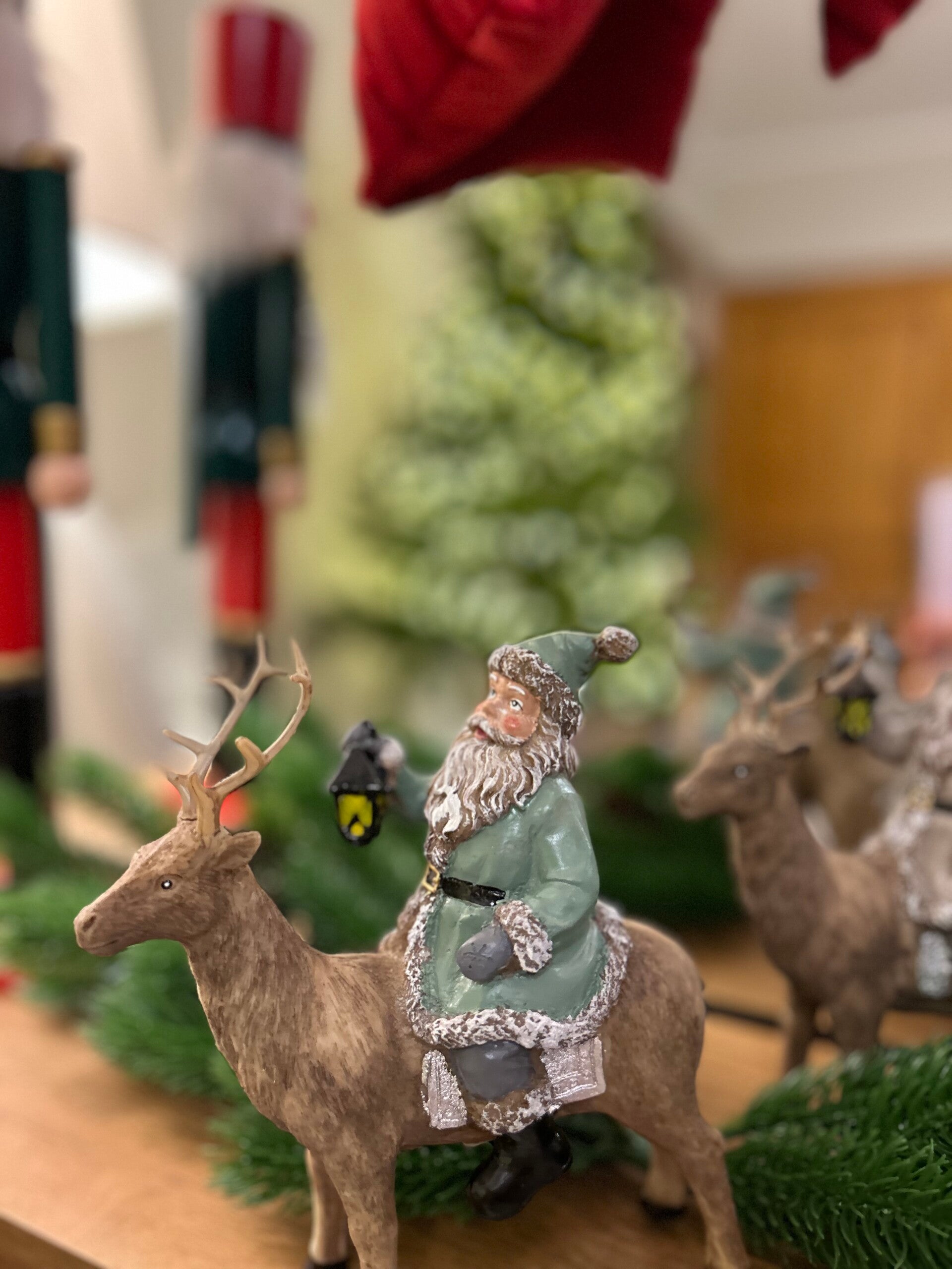 Porta la magia del Natale nella tua casa con questa incantevole decorazione di Babbo Natale a cavallo di una renna. Realizzata con cura nei dettagli, raffigura un dolce Babbo Natale dal fascino fiabesco che, con la sua lanterna accesa, guida la renna attraverso la notte innevata.