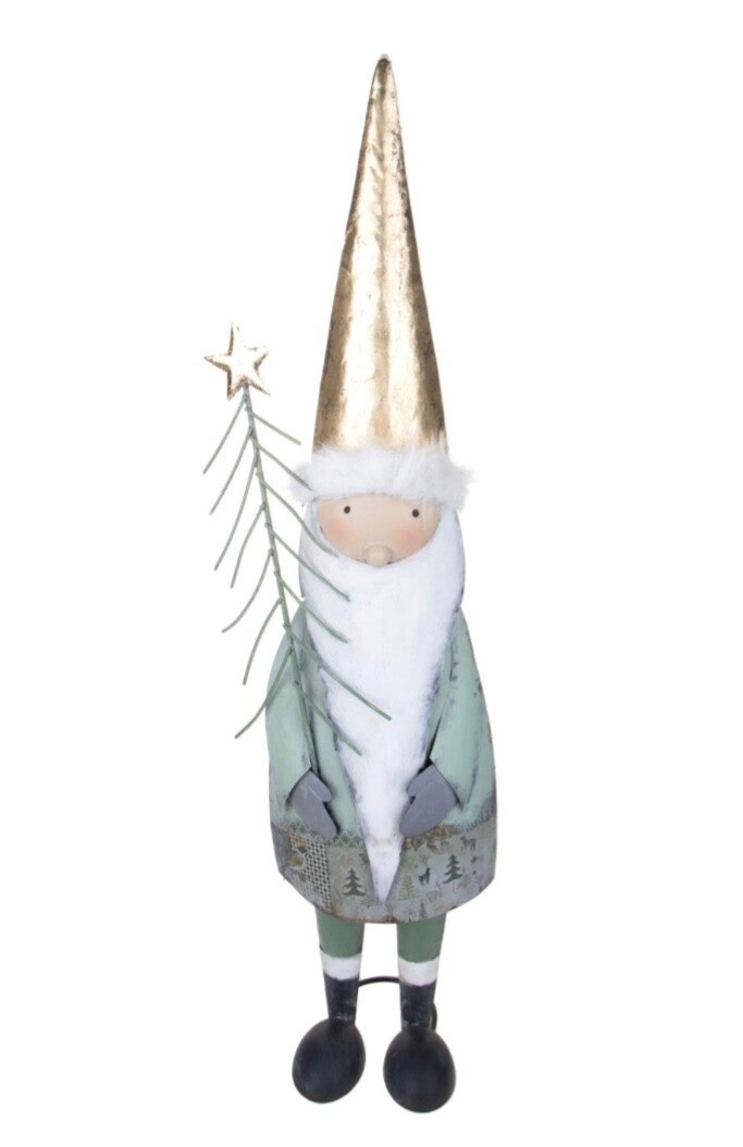 Porta un tocco di magia nordica nella tua casa con questo raffinato Babbo Natale decorativo! Realizzato con cura nei dettagli, questo simpatico personaggio si distingue per il suo lungo cappello dorato, la soffice barba bianca e l’elegante cappottino verde salvia con motivi invernali. Nelle mani tiene un rametto stilizzato con stella dorata, simbolo di speranza e luce natalizia.